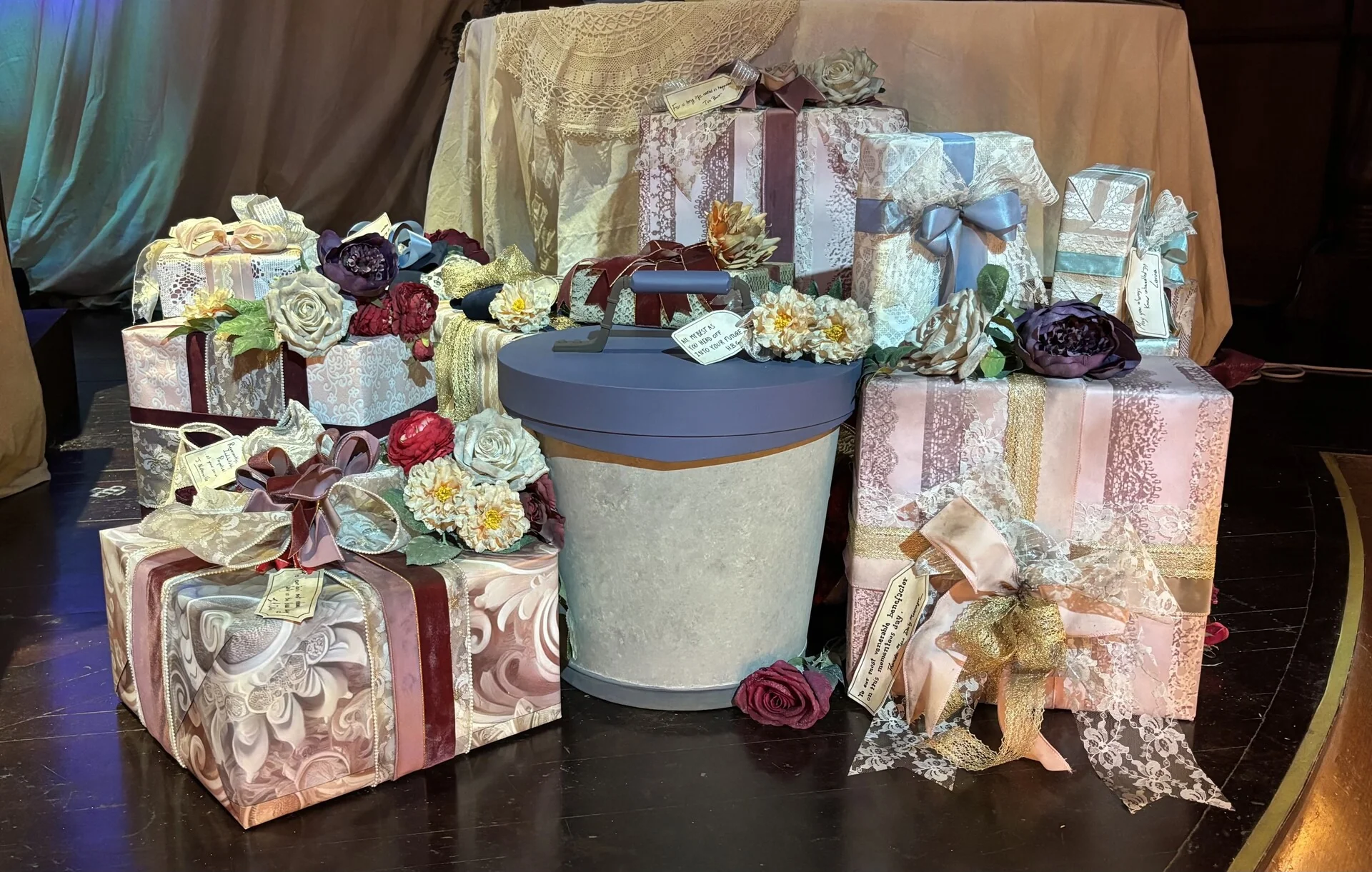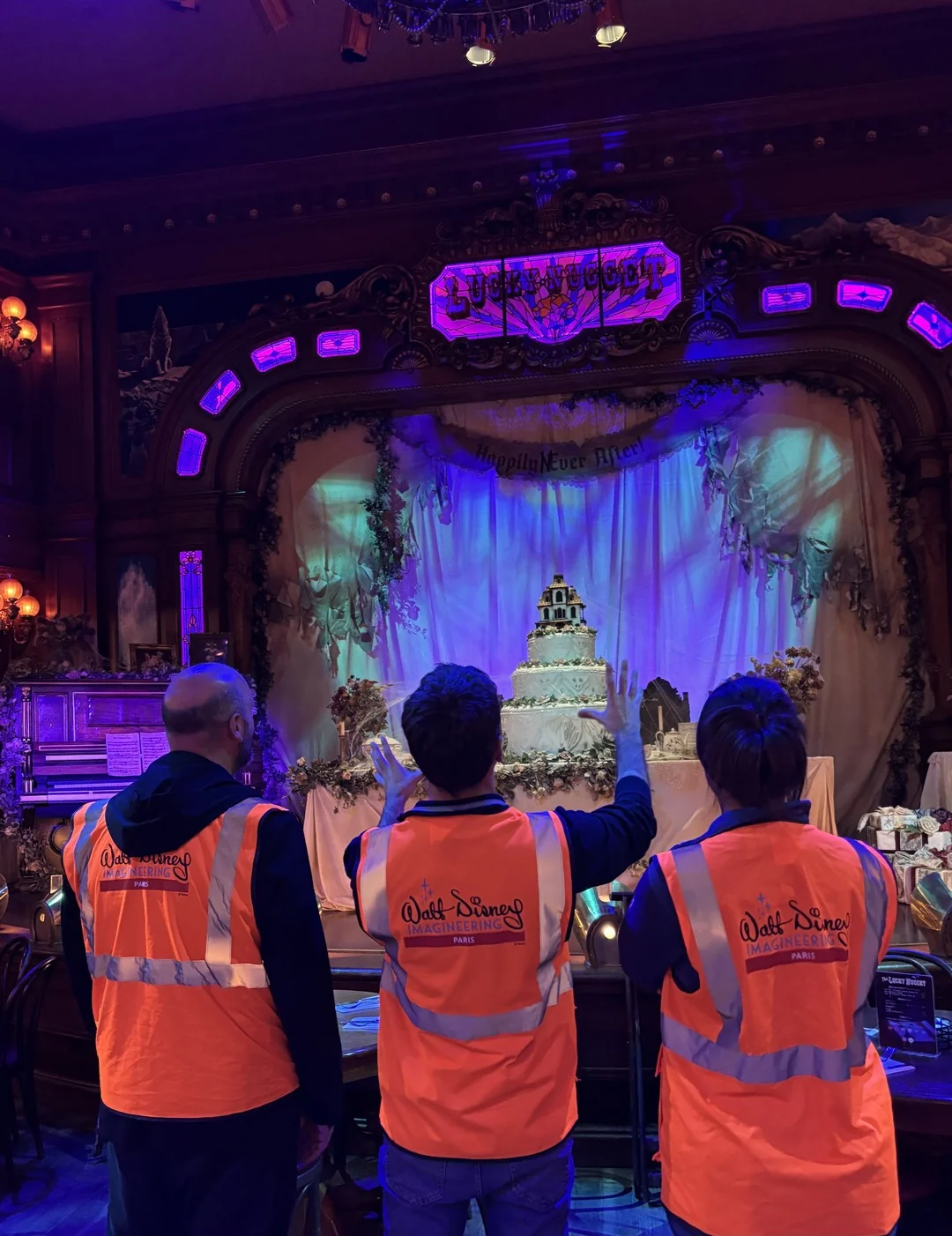 « Un détail que j’apprécie beaucoup est la silhouette de Phantom Manor en haut de la pièce montée. Grâce à elle, on se rend bien compte que l’établissement The Lucky Nugget Saloon a tout fait en sorte pour satisfaire et honorer l’homme le plus riche de la ville en célébrant les noces de sa fille », précise Thomas Levert. « Si vous regardez attentivement les éléments de décors, on retrouve un autre détail que j’affectionne particulièrement : le nom du futur mari de Melanie Ravenswood semble ne jamais être visible. Le mystère reste entier ! D’ailleurs, les quatre menus situés sur la table principale en est un bon exemple : le nom du mari est systématiquement effacé, à l’image de la disparition des quatre prétendants. »