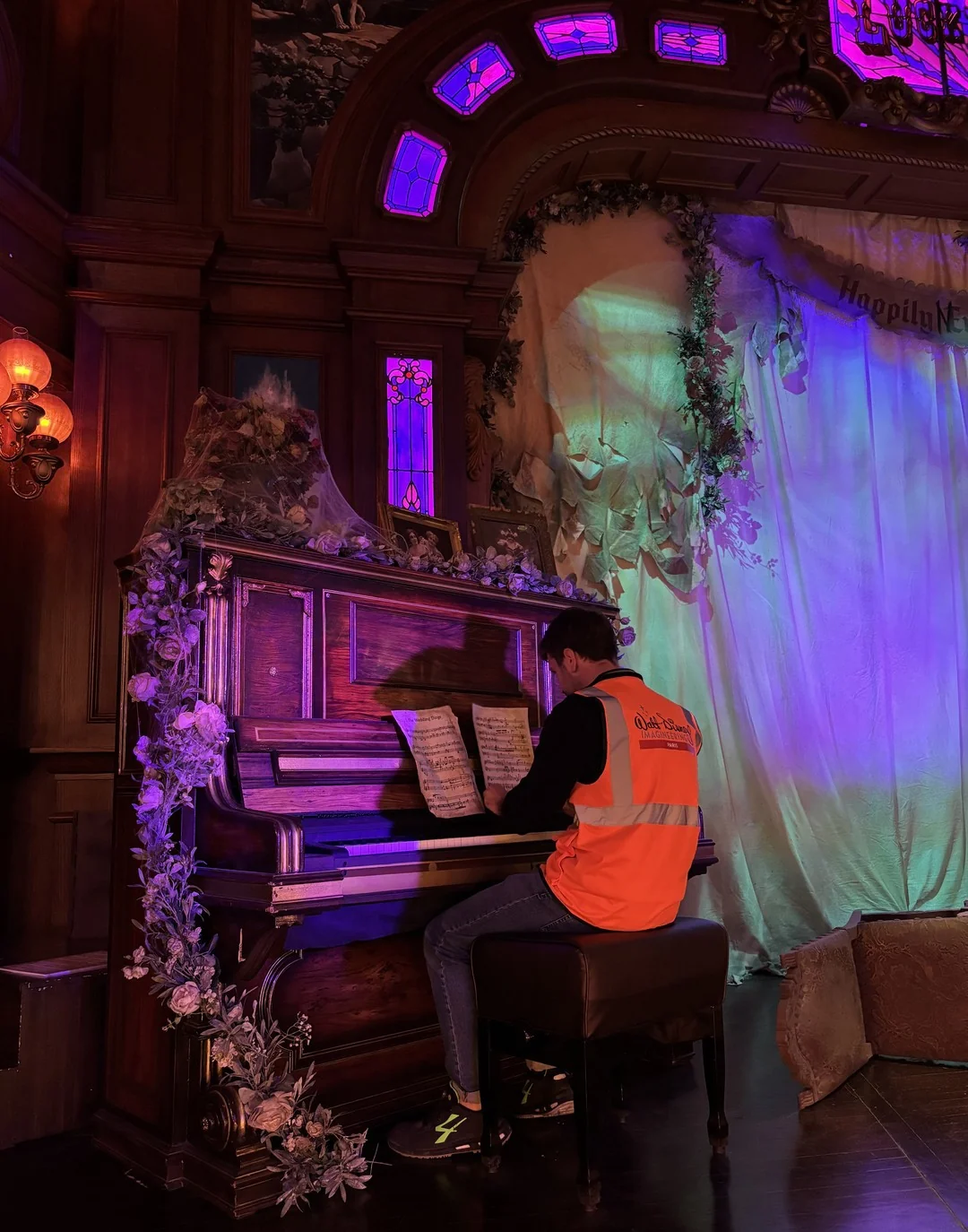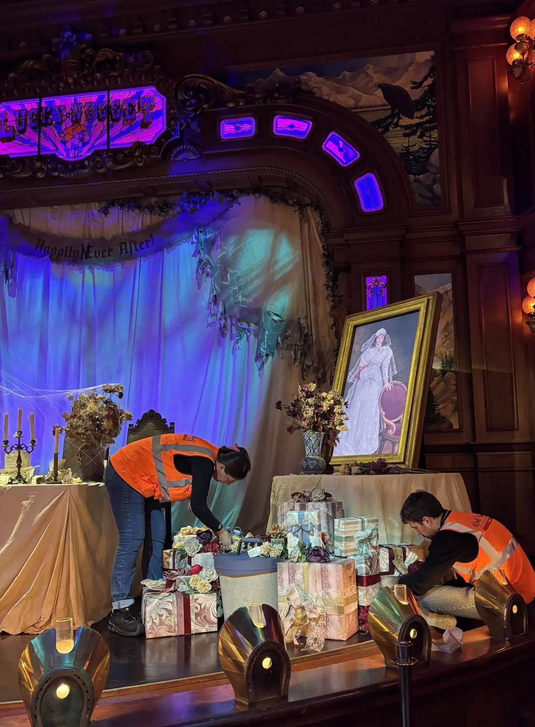 Les équipes de Walt Disney Imagineering Paris, en collaboration avec Design & Delivery, ont conçu une expérience visuelle inédite mêlant des décorations lugubres à une ambiance musicale et lumineuse inquiétante inspirée de l’attraction Phantom Manor. Du 1er octobre au 2 novembre 2025, The Lucky Nugget Saloon devient un lieu de réception aujourd’hui laissé à l’abandon. D’après les Imagineers, il devait autrefois accueillir une somptueuse fête en l’honneur des Ravenswood, l’une des familles les plus riches et influentes de la ville. Il était en effet prévu d’y célébrer les noces à venir de leur fille, Melanie – mais l’étrange disparition de son fiancé a mis un terme aux épousailles, et la fête n’eut jamais lieu…