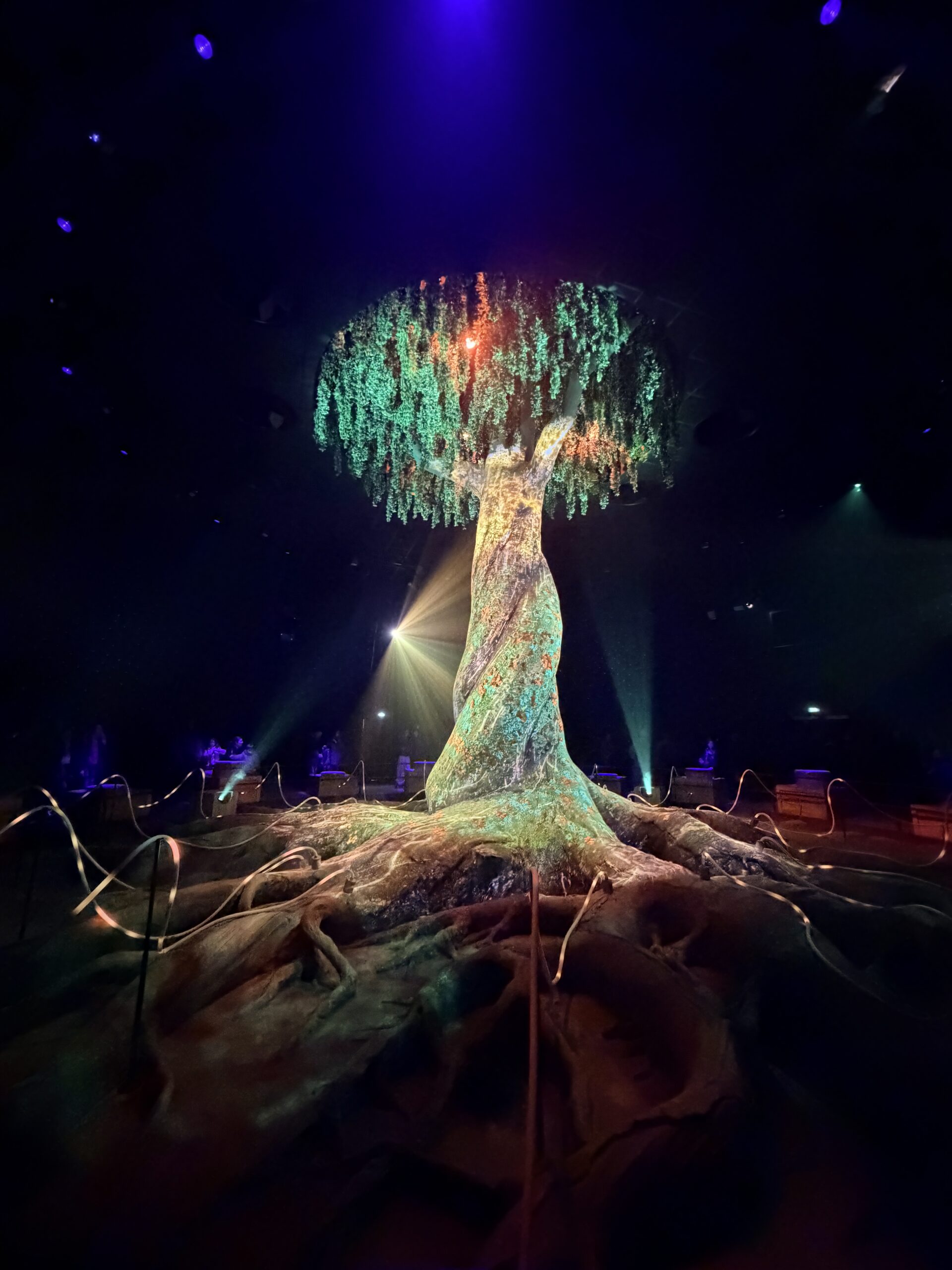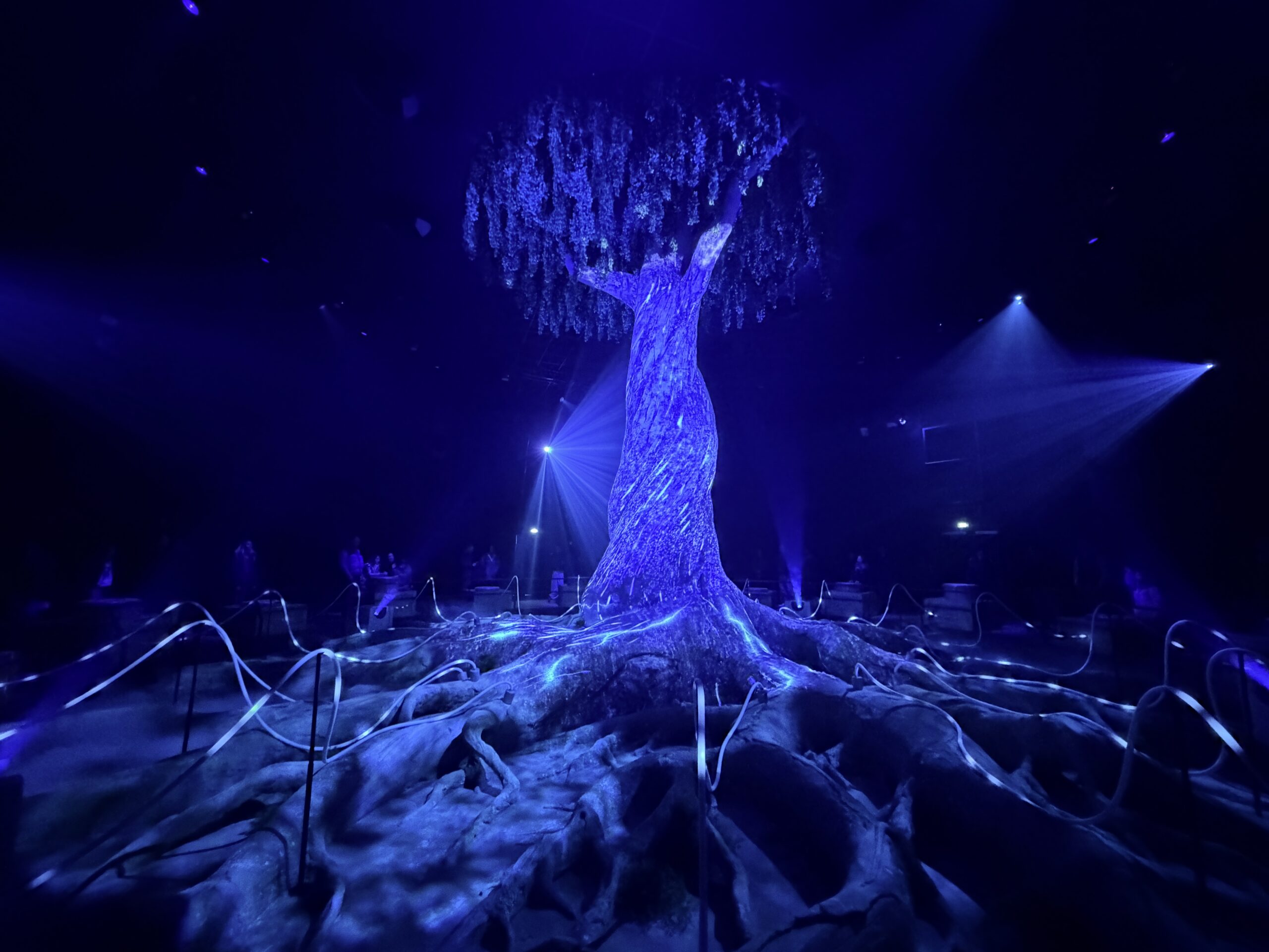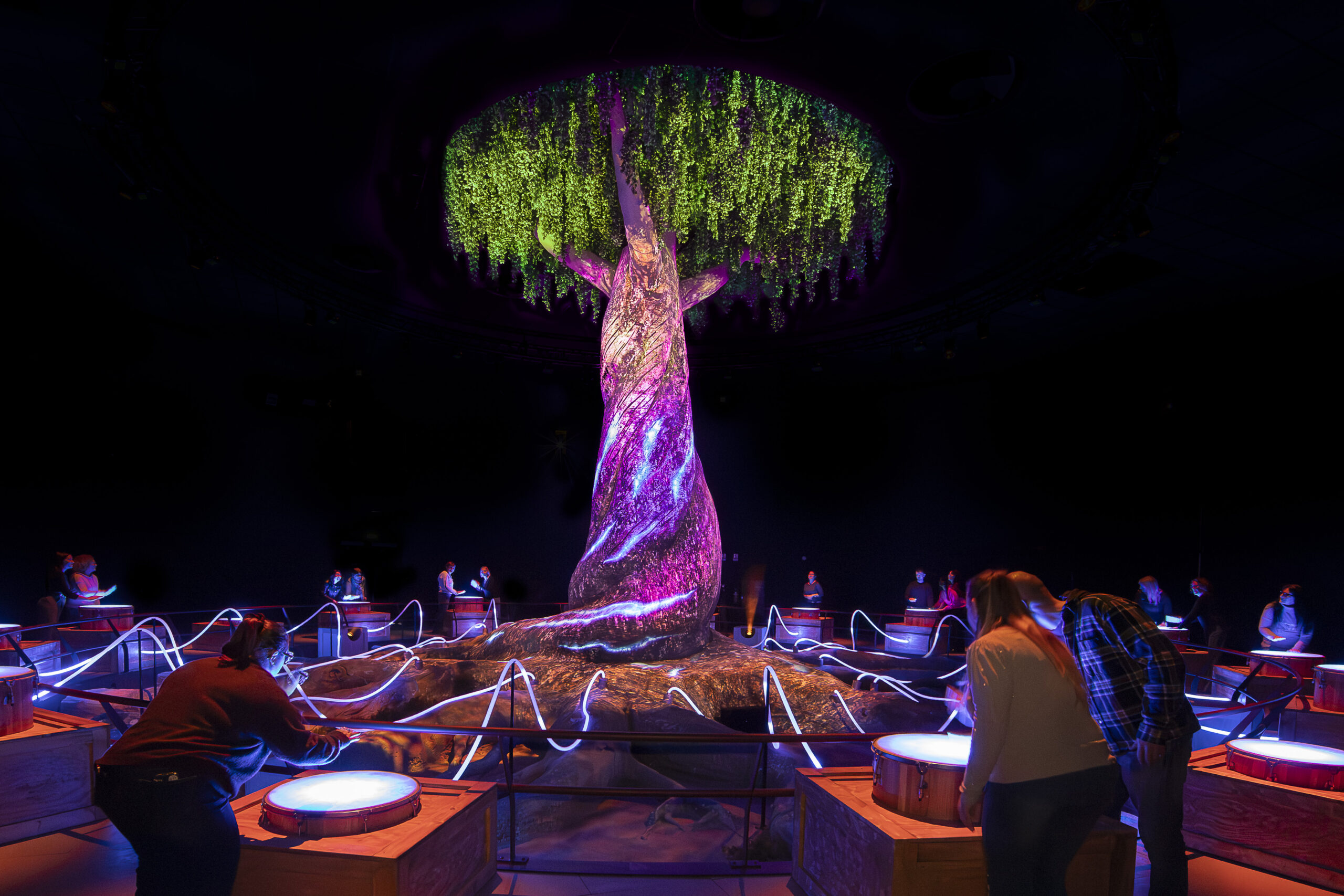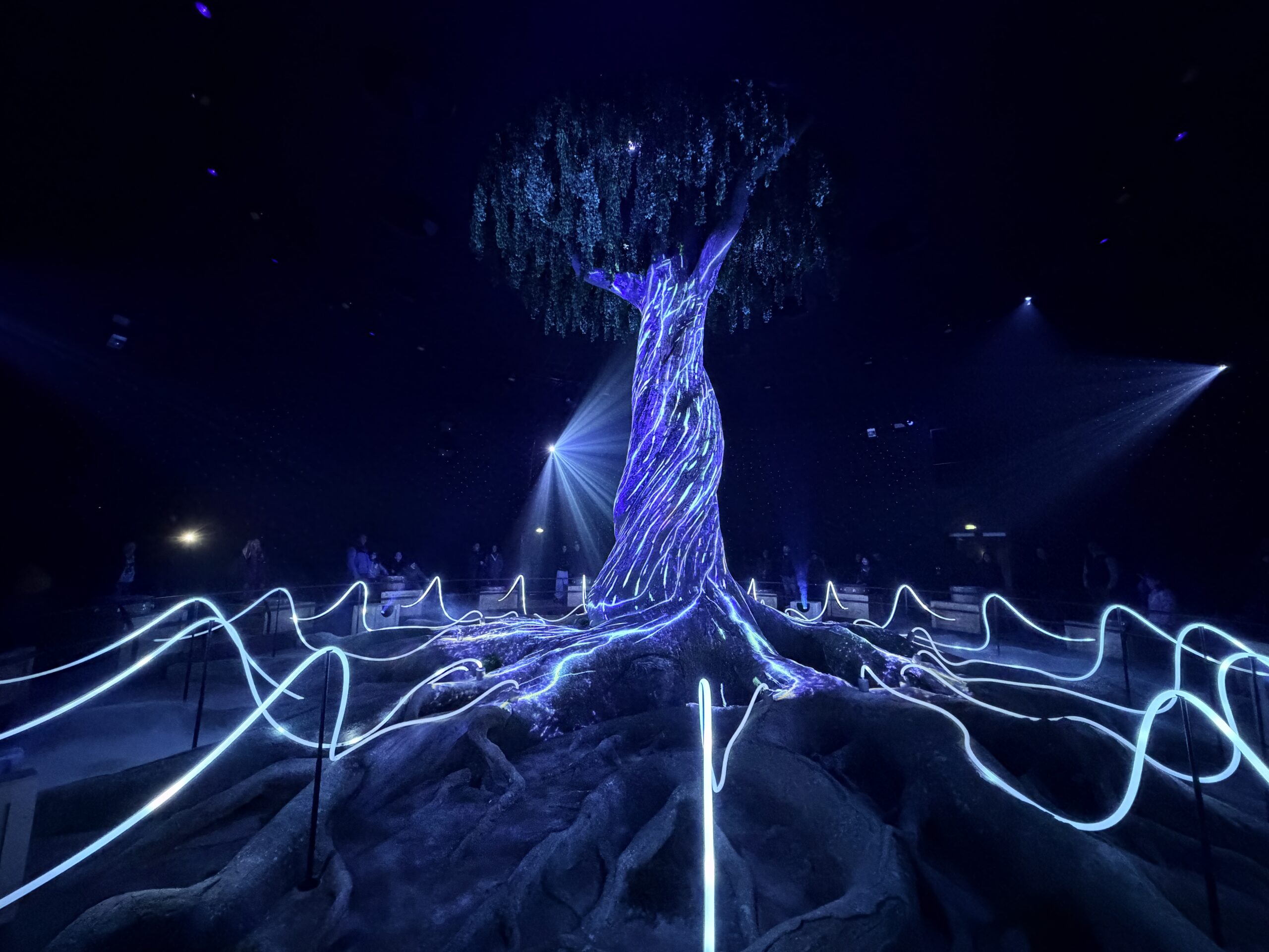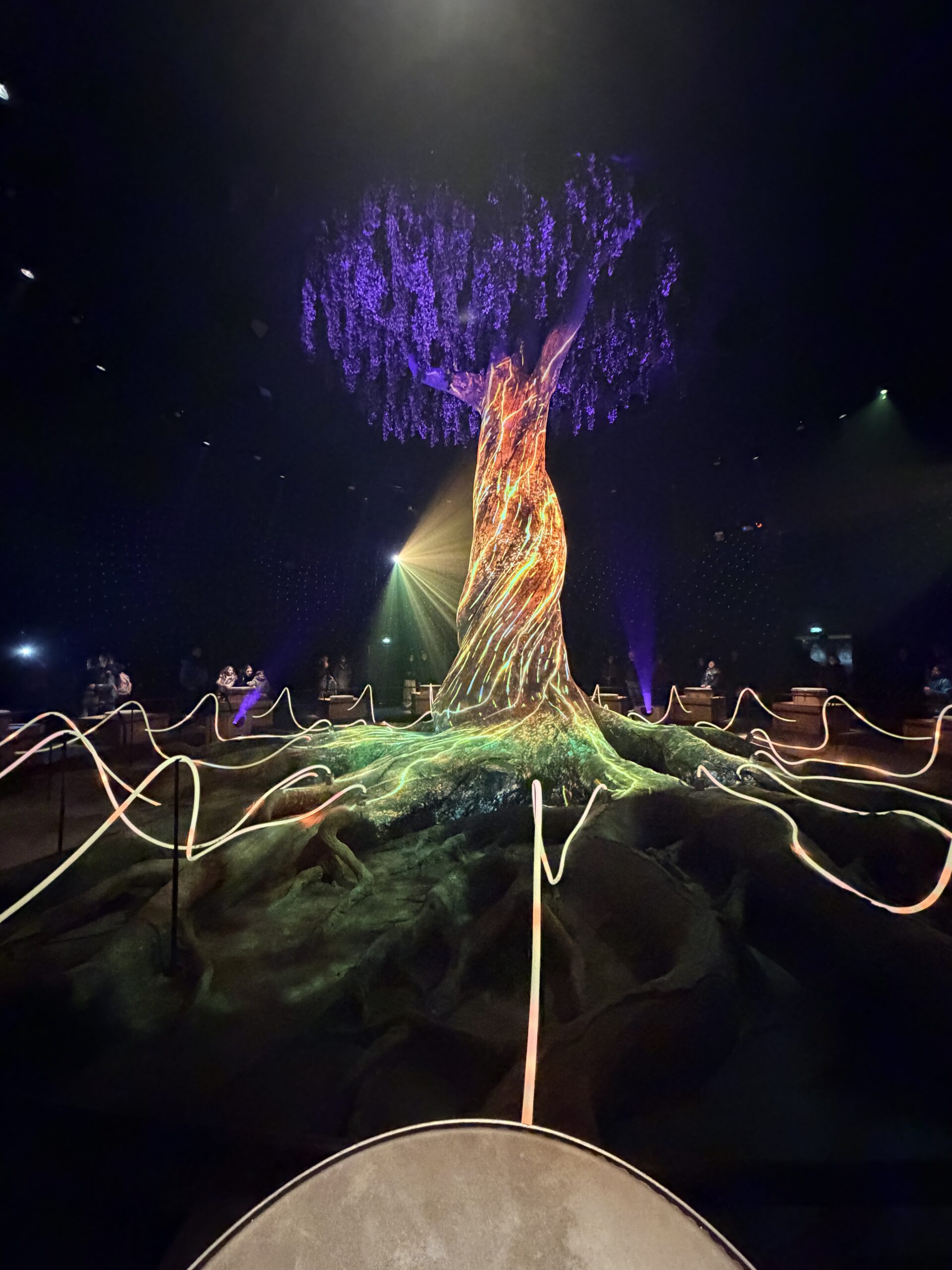 Dès que nous entrons dans cette salle, nous sommes éblouis par l’arbre majestueux qui trône au milieu de la pièce. Même si ce dernier est mal en point, il en impose par sa grandeur. Ses racines sont tentaculaires. Certaines d’entre elles sont lumineuses. Elles relient l’arbre à des tambours placés tout autour de lui.