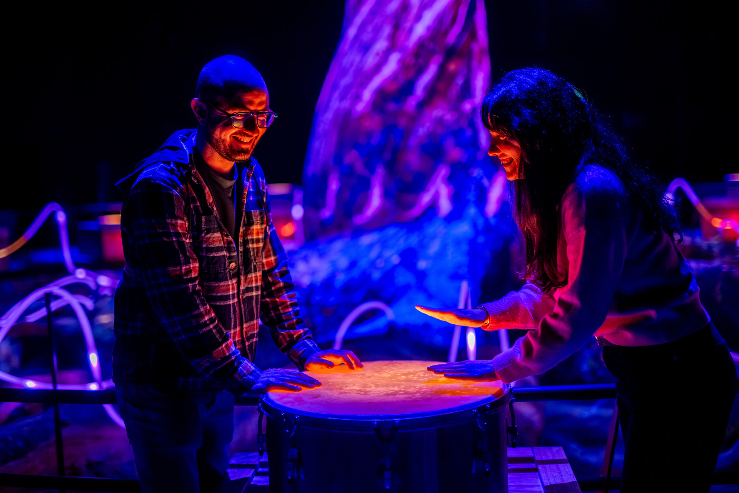L’arbre nous envoie des impulsions lumineuses. Quand ces dernières arrivent au niveau du tambour, nous devons taper sur l’instrument.